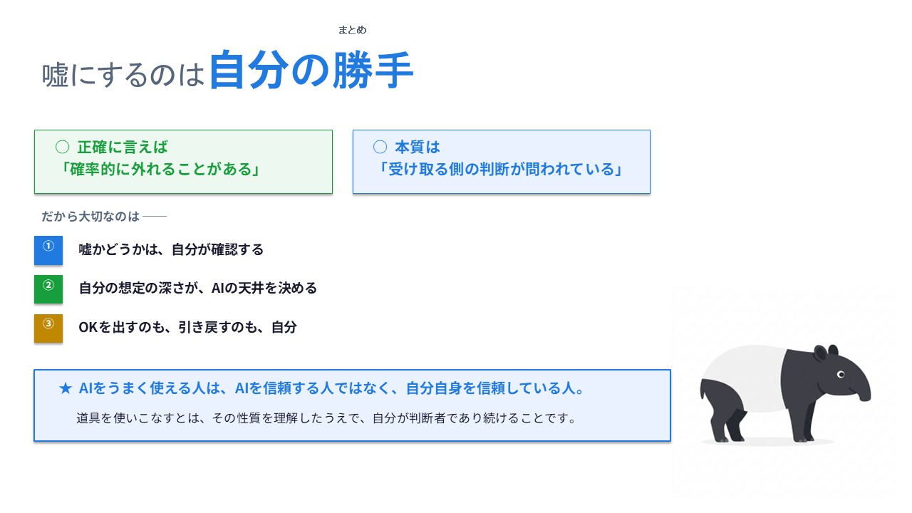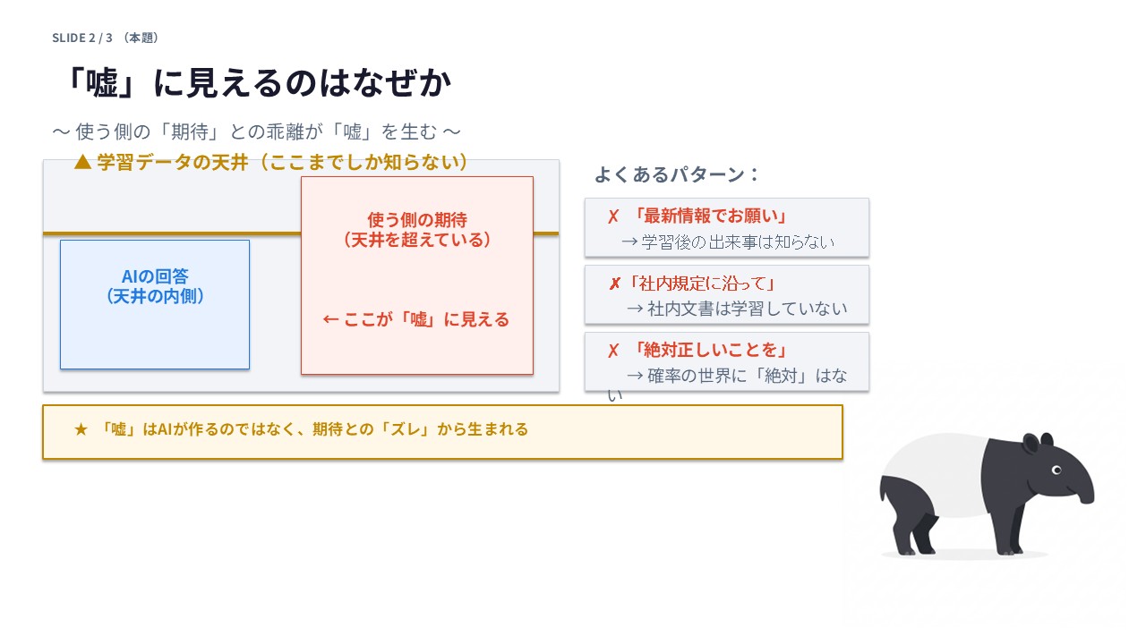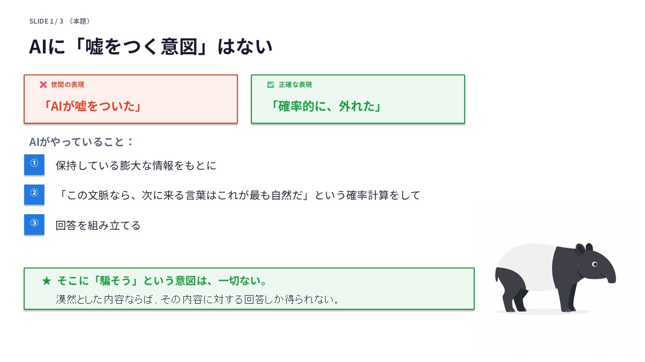 - AIは「嘘をつく」のではなく、確率的に外れることがある