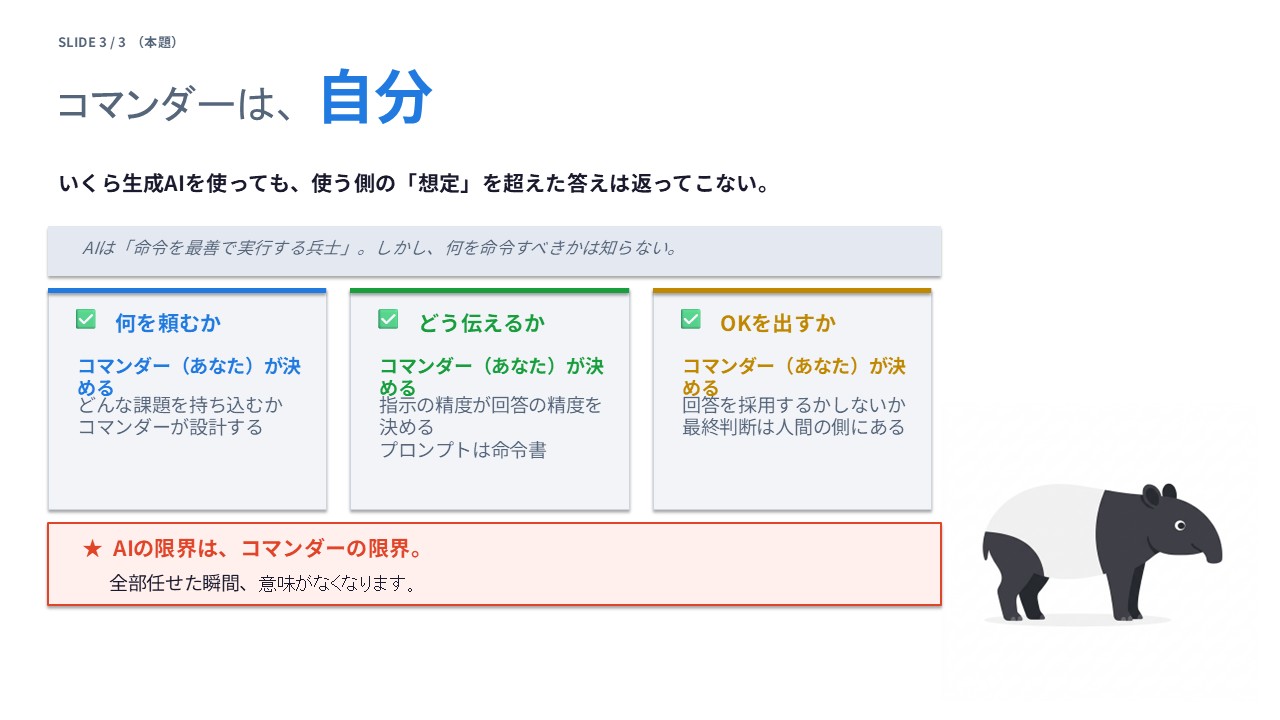 といった、AI時代に必要な本質的な考え方が共有されました。