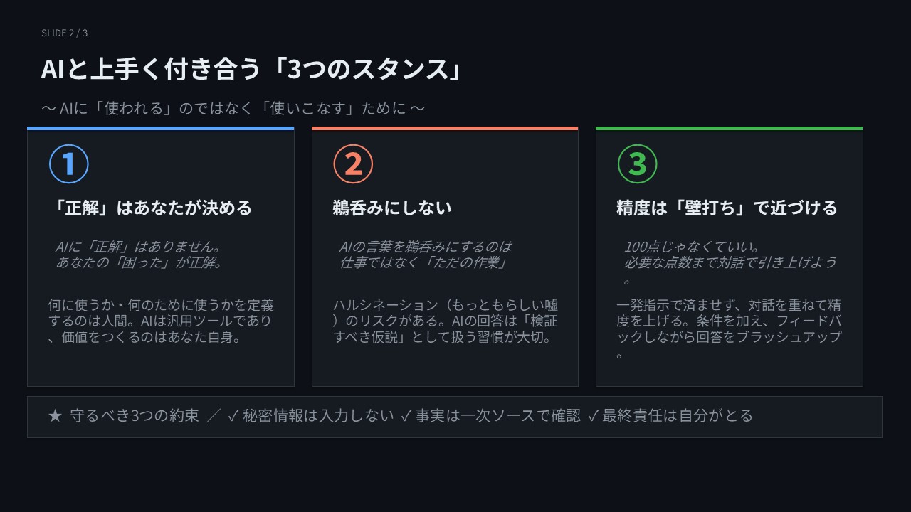 そのため、AIの回答は“仮説”として検証する姿勢が重要です。